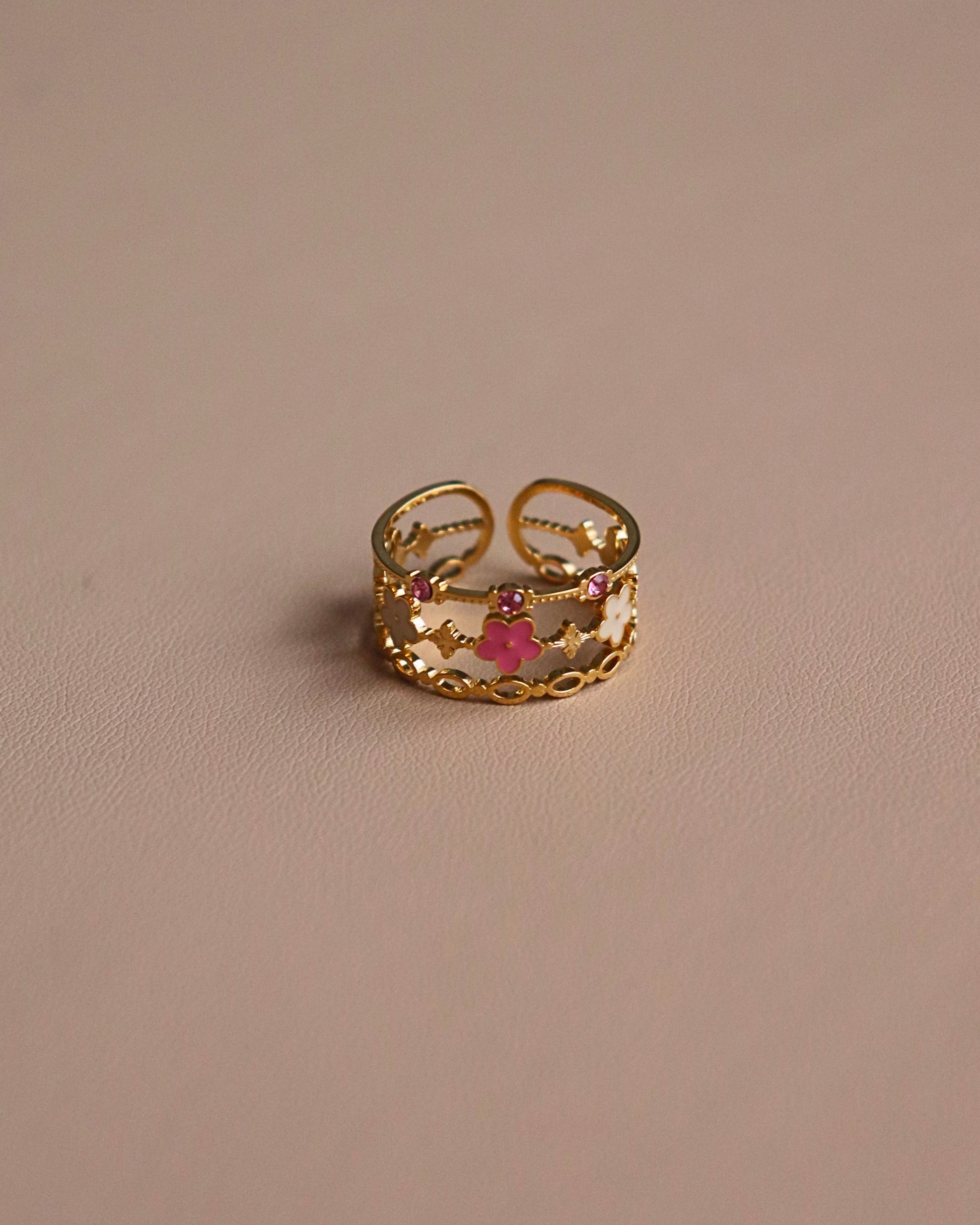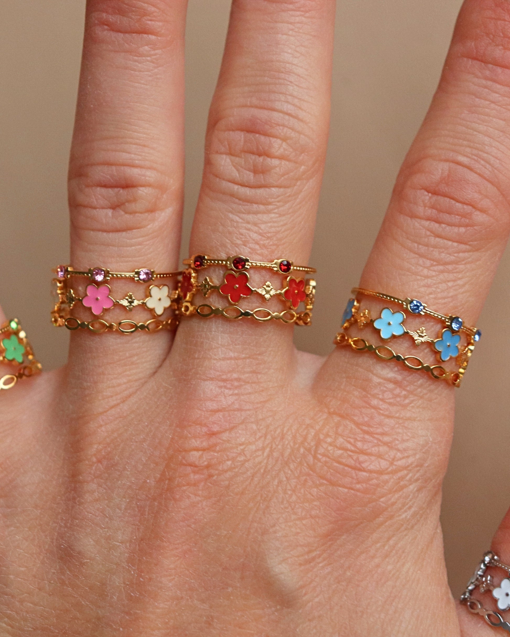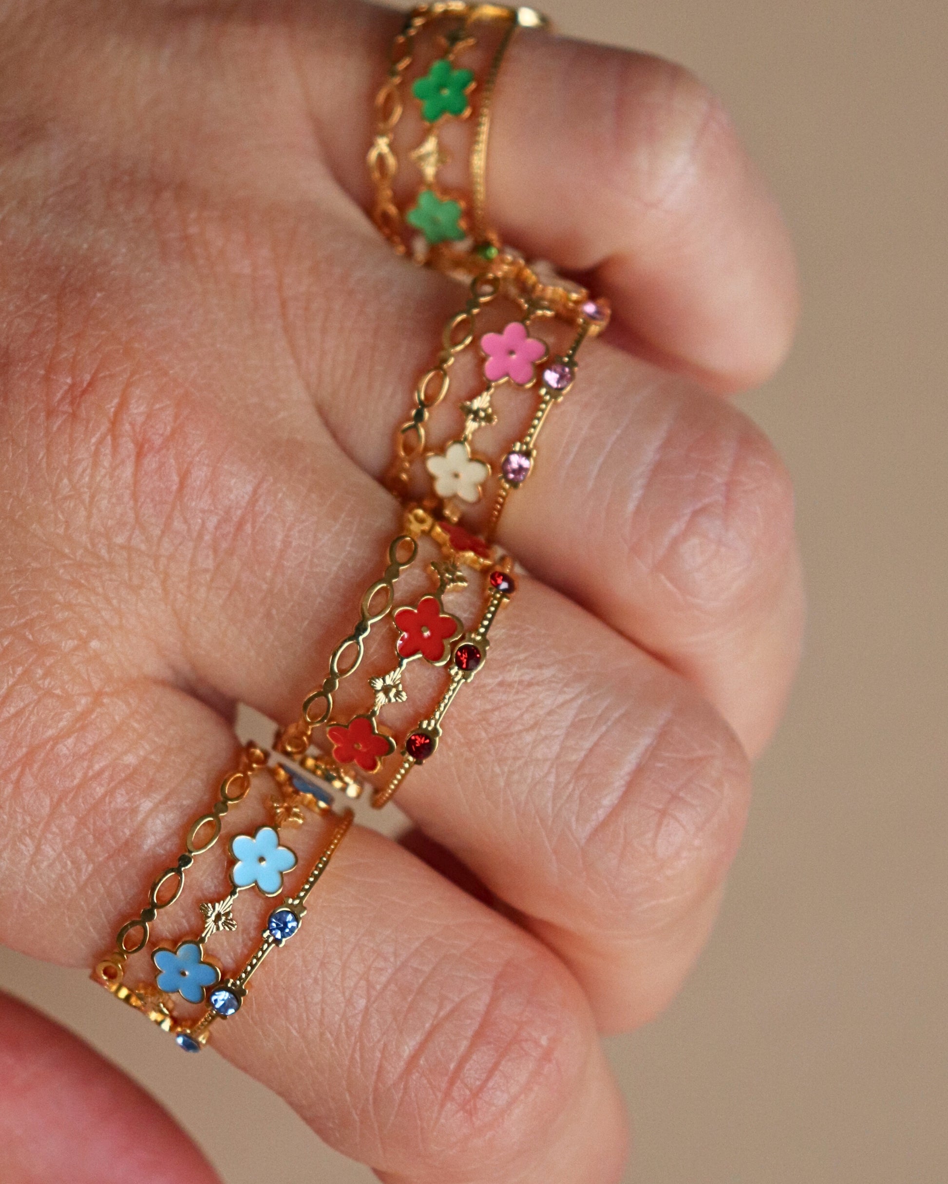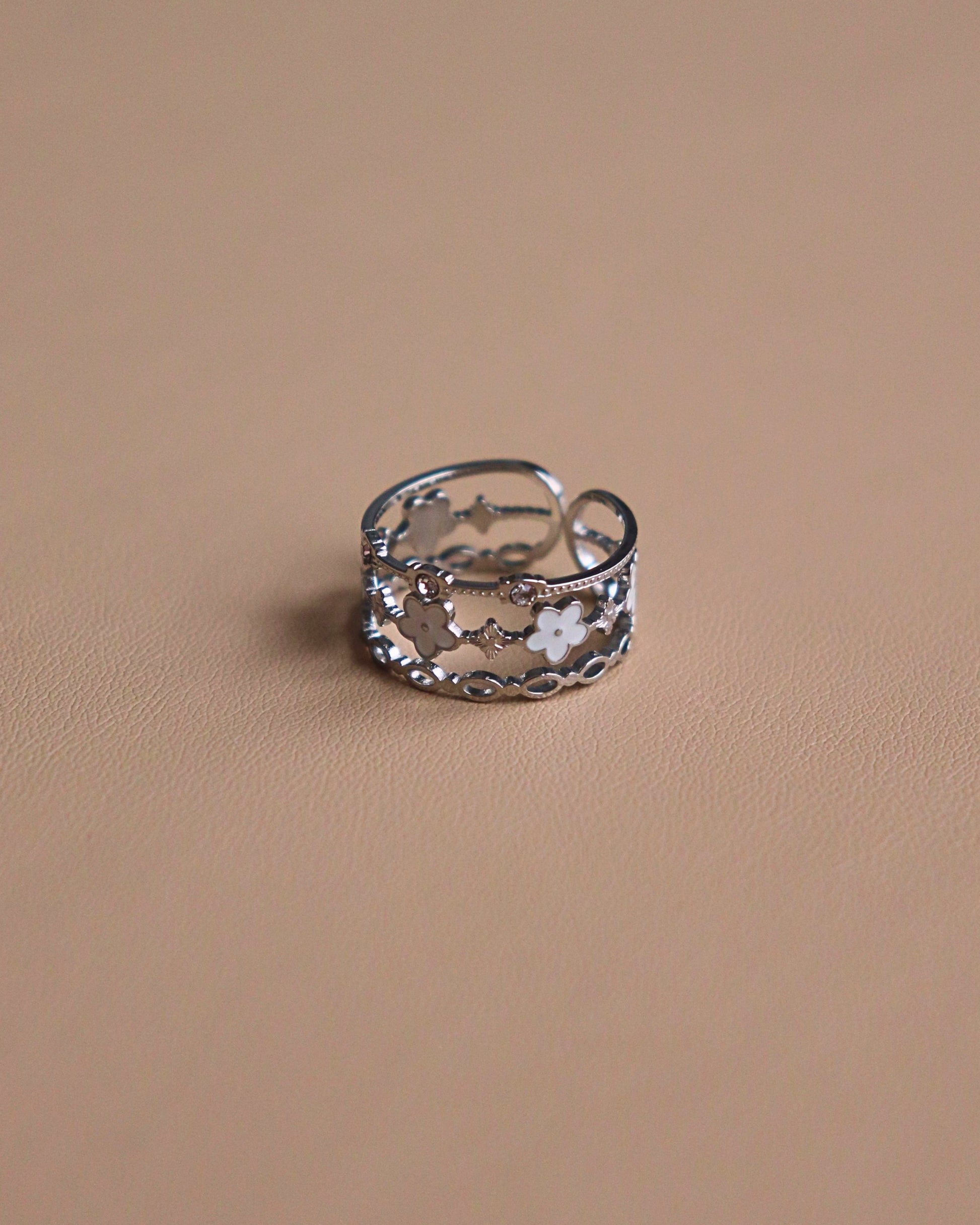 La bague Bianca évoque un jardin en fleur, avec ses petites marguerites en relief posées sur un double anneau argenté. Délicate et pleine de fraîcheur, elle apporte une note de douceur à la main.
