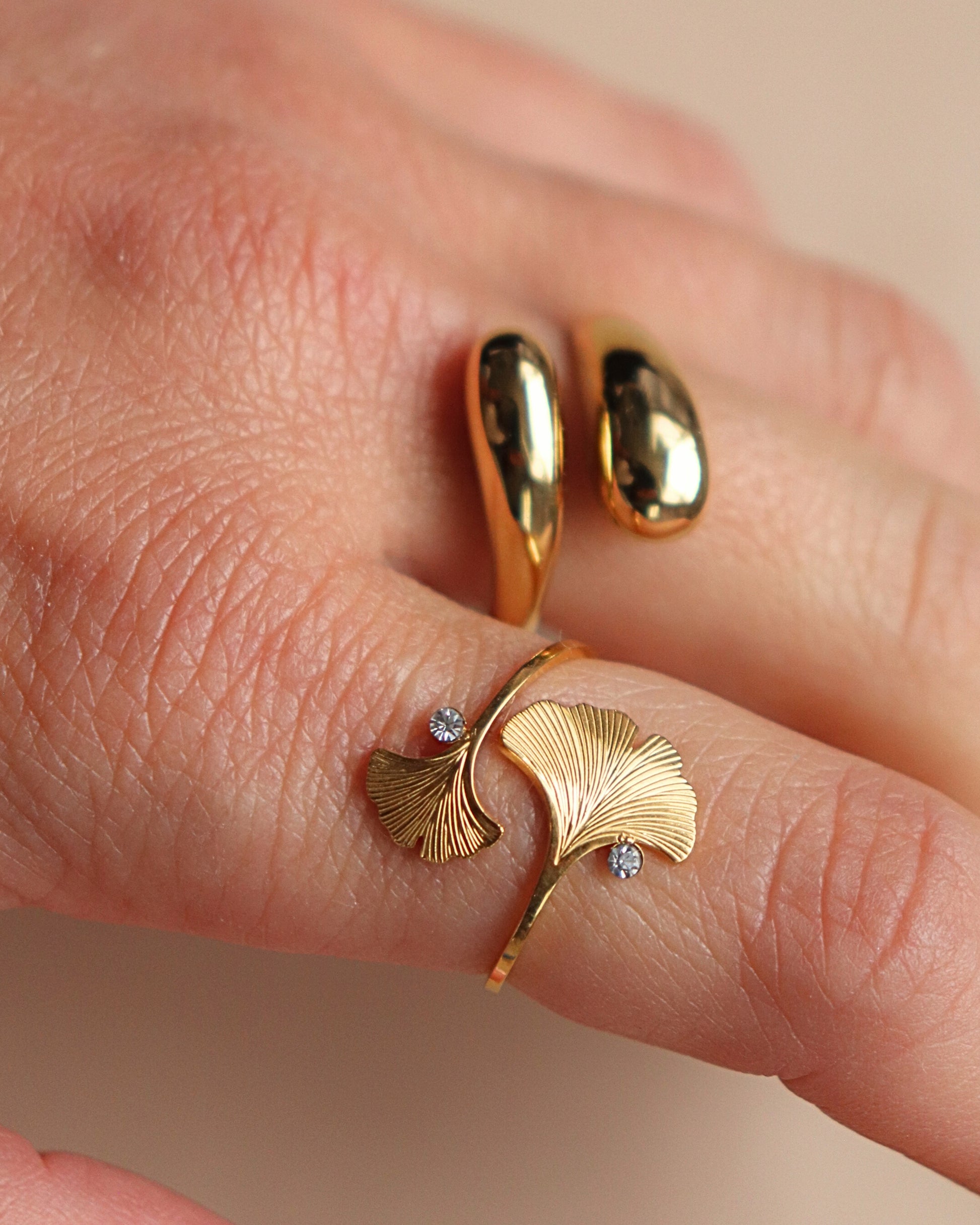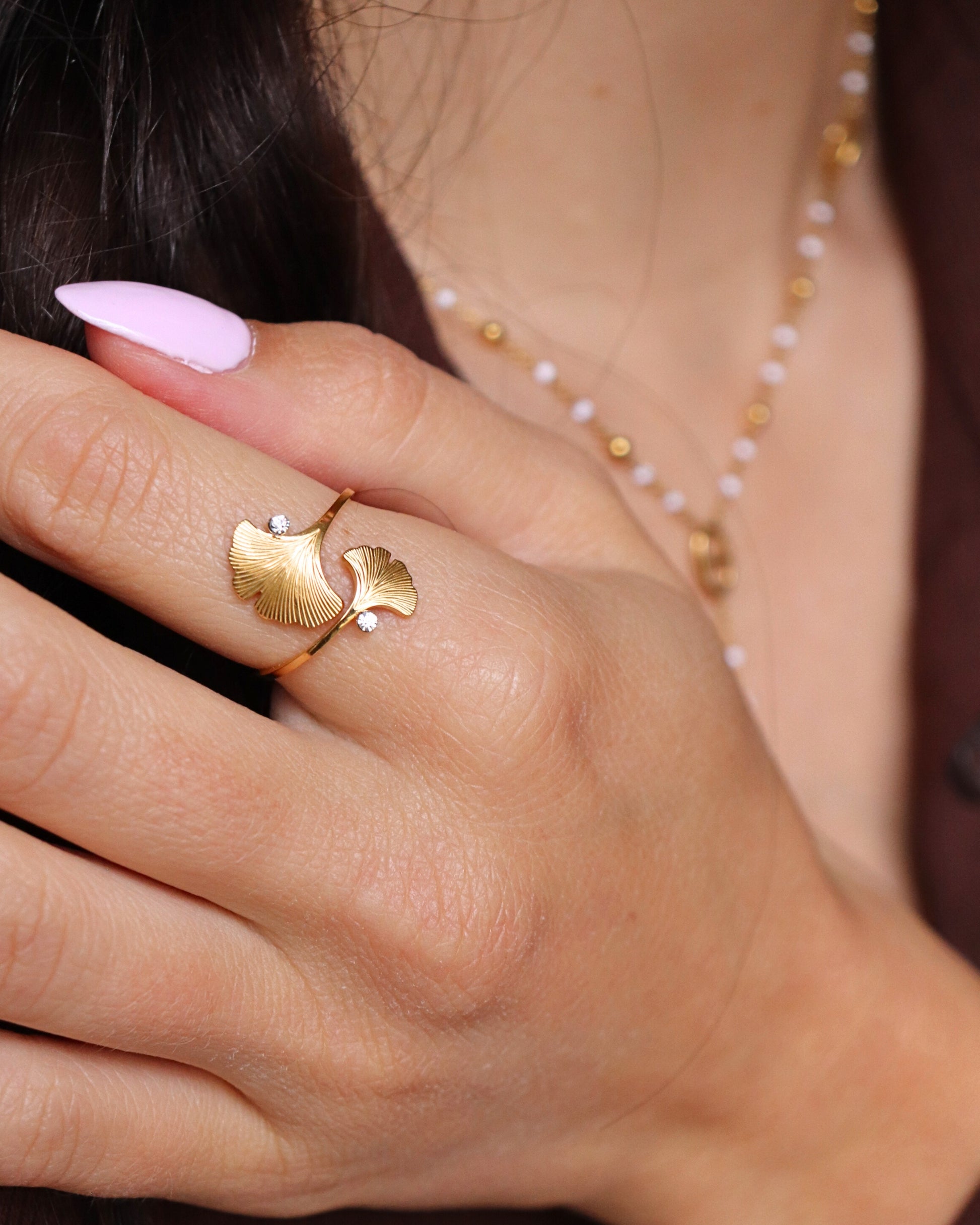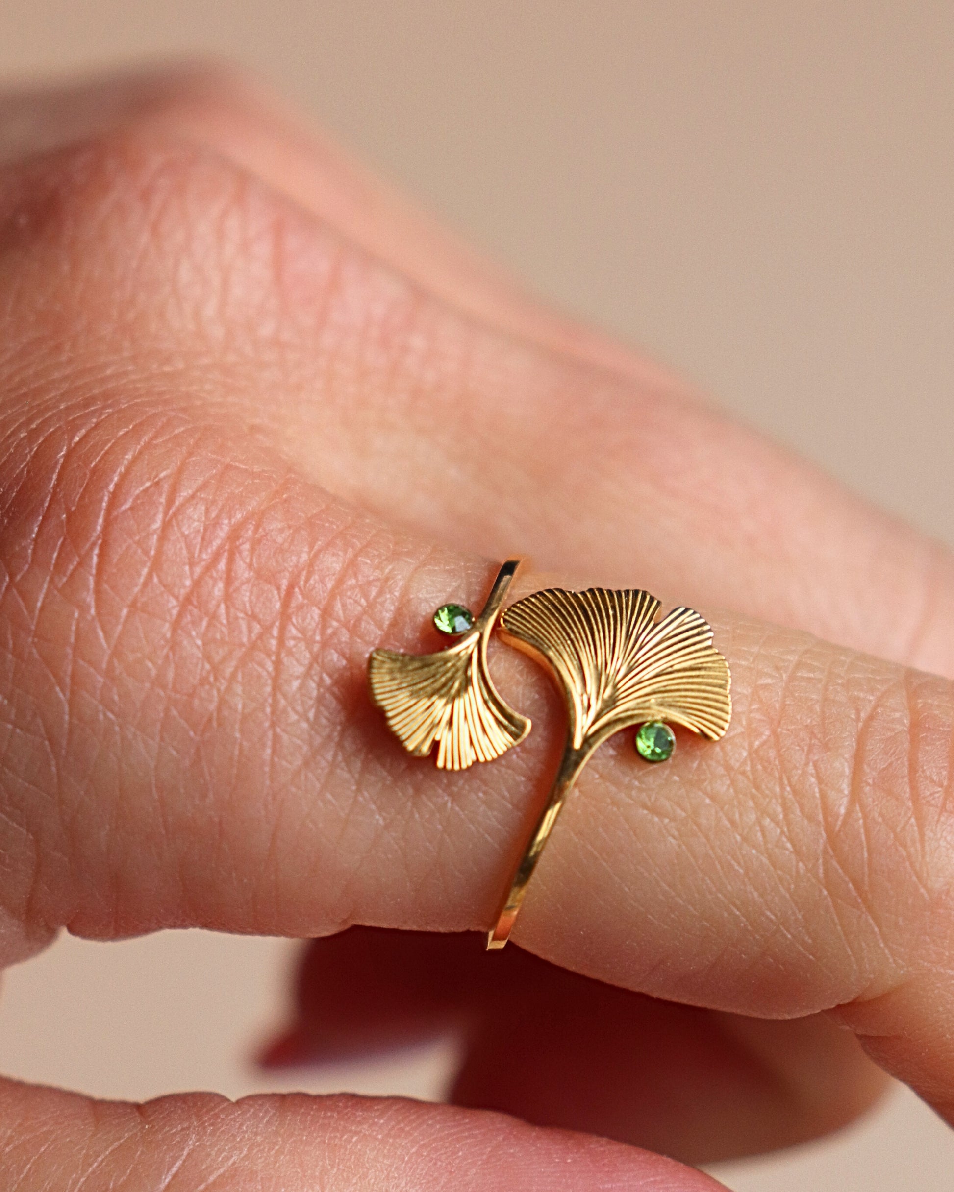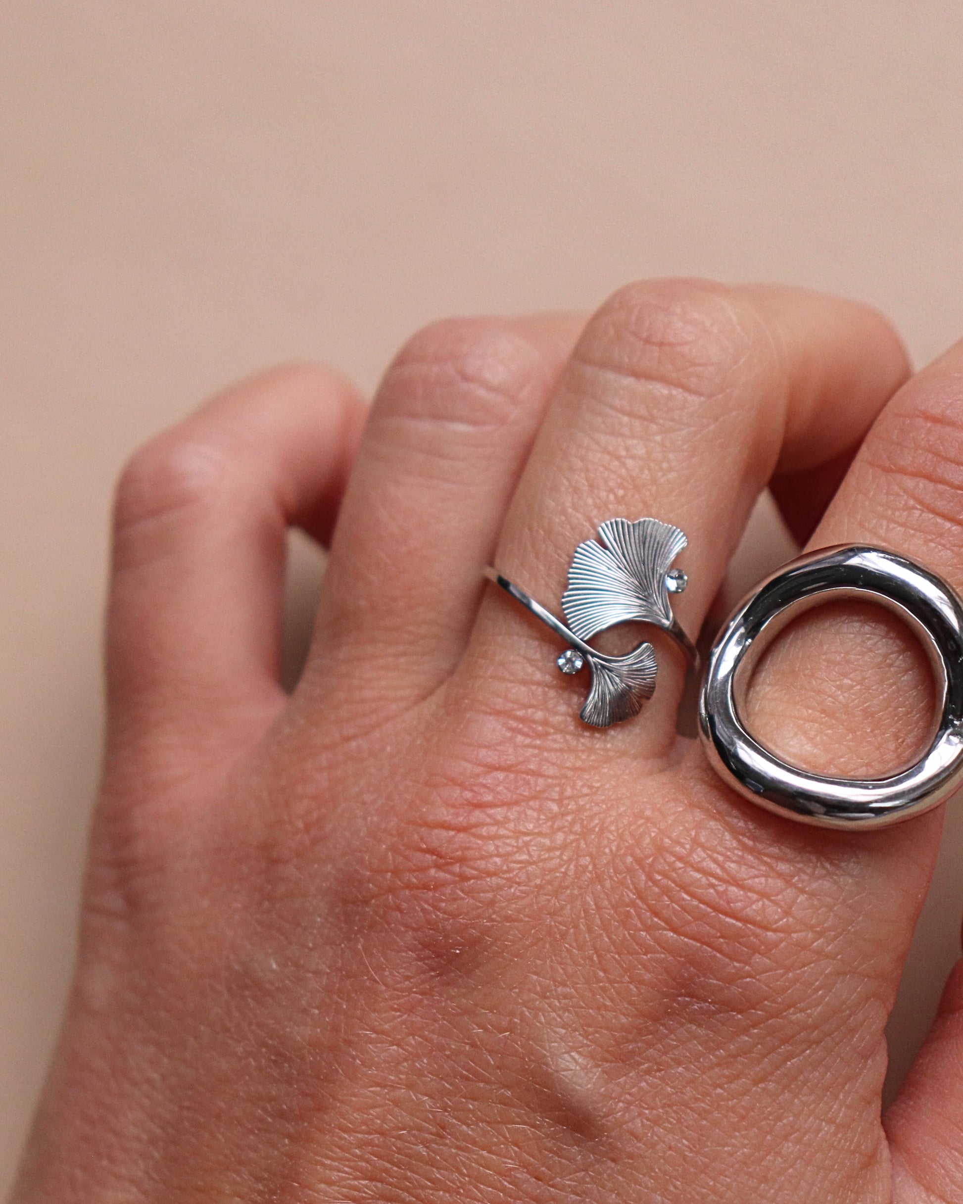 La bague Palmer met en valeur deux feuilles de ginkgo, cet arbre qui fait partie des plus anciens du monde et qui a survécu à la bombe d’Hiroshima. Un symbole de force et d’éternité.