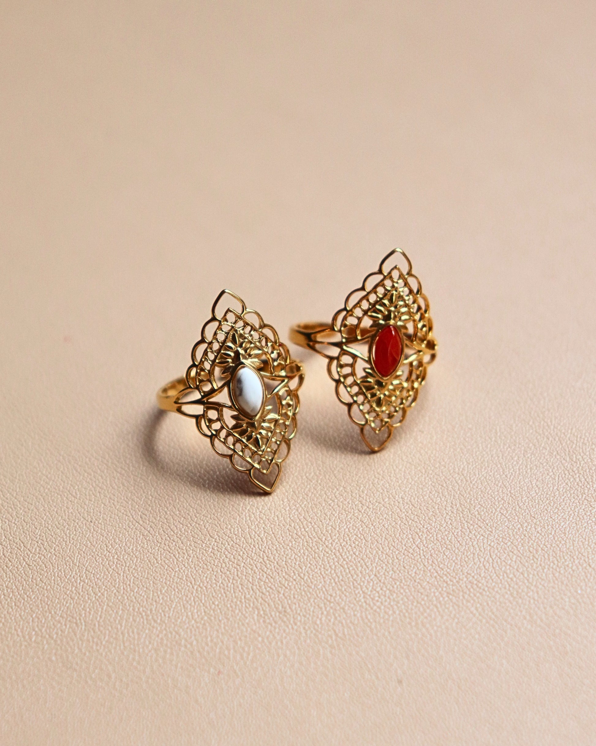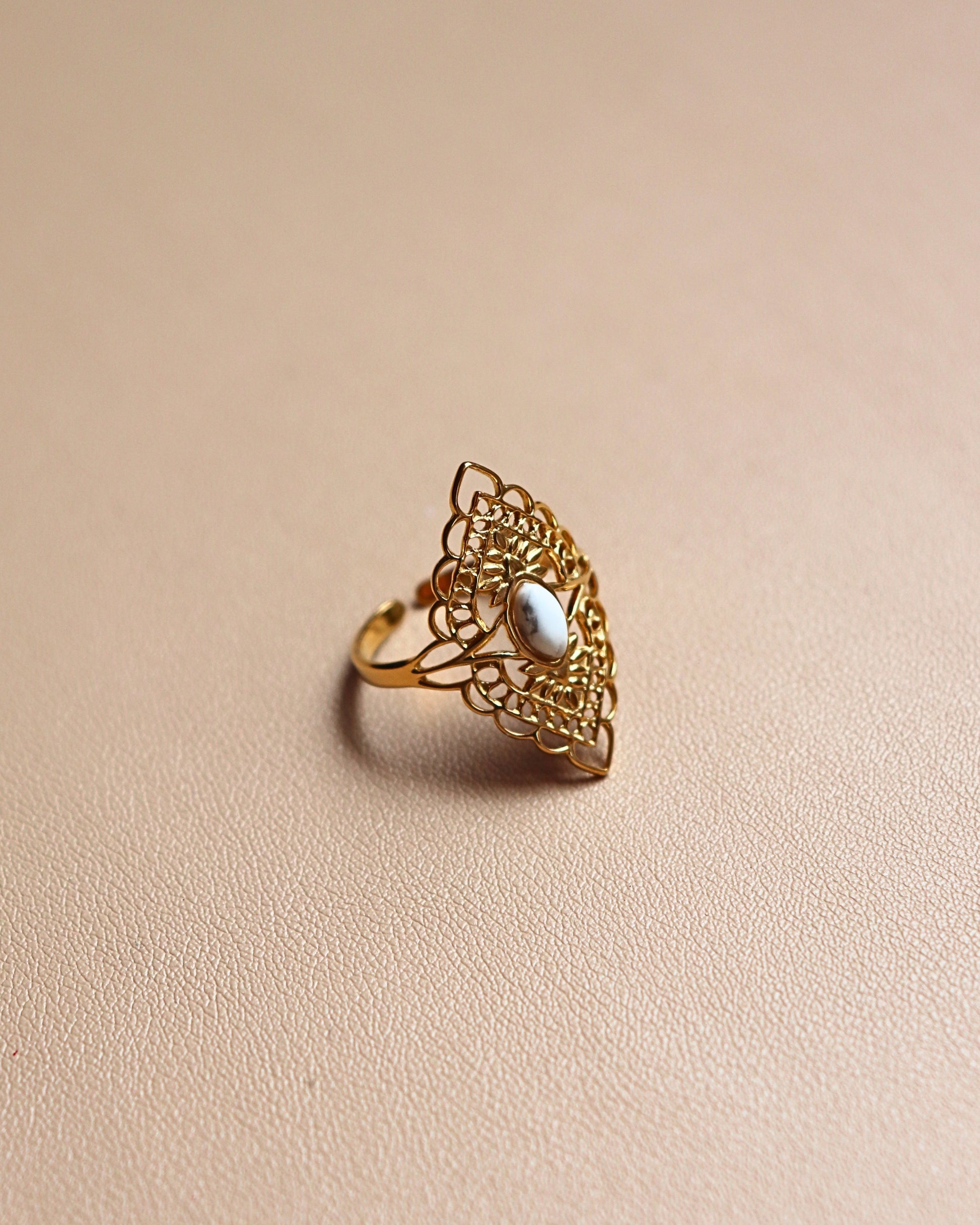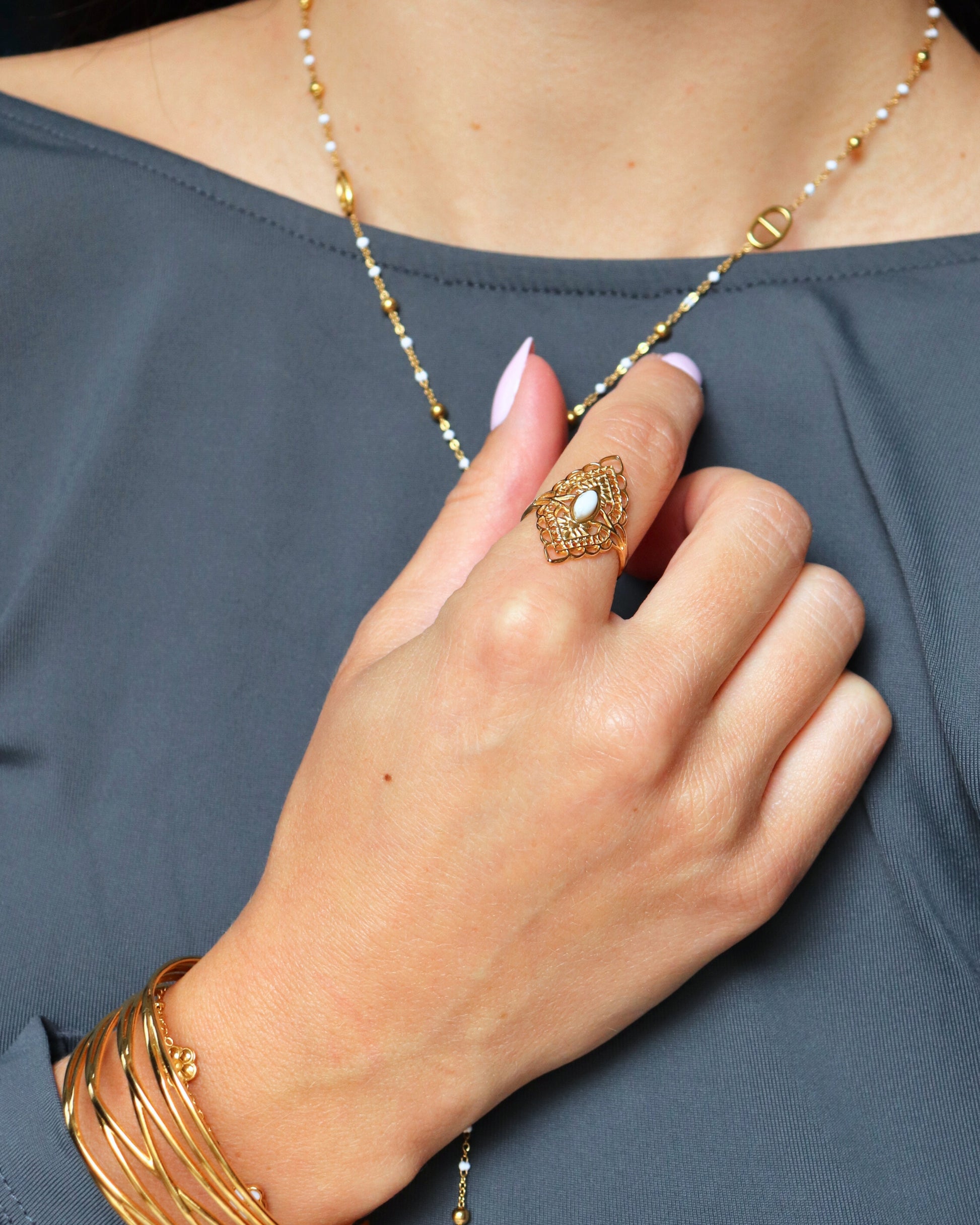 La bague thaïsia dévoile une silhouette fine et travaillée, sublimée par une perle ovale en son centre. Son motif ajouré dessine des arabesques délicates qui rappellent les bijoux anciens. Une pièce qui mêle charme rétro et élégance moderne.