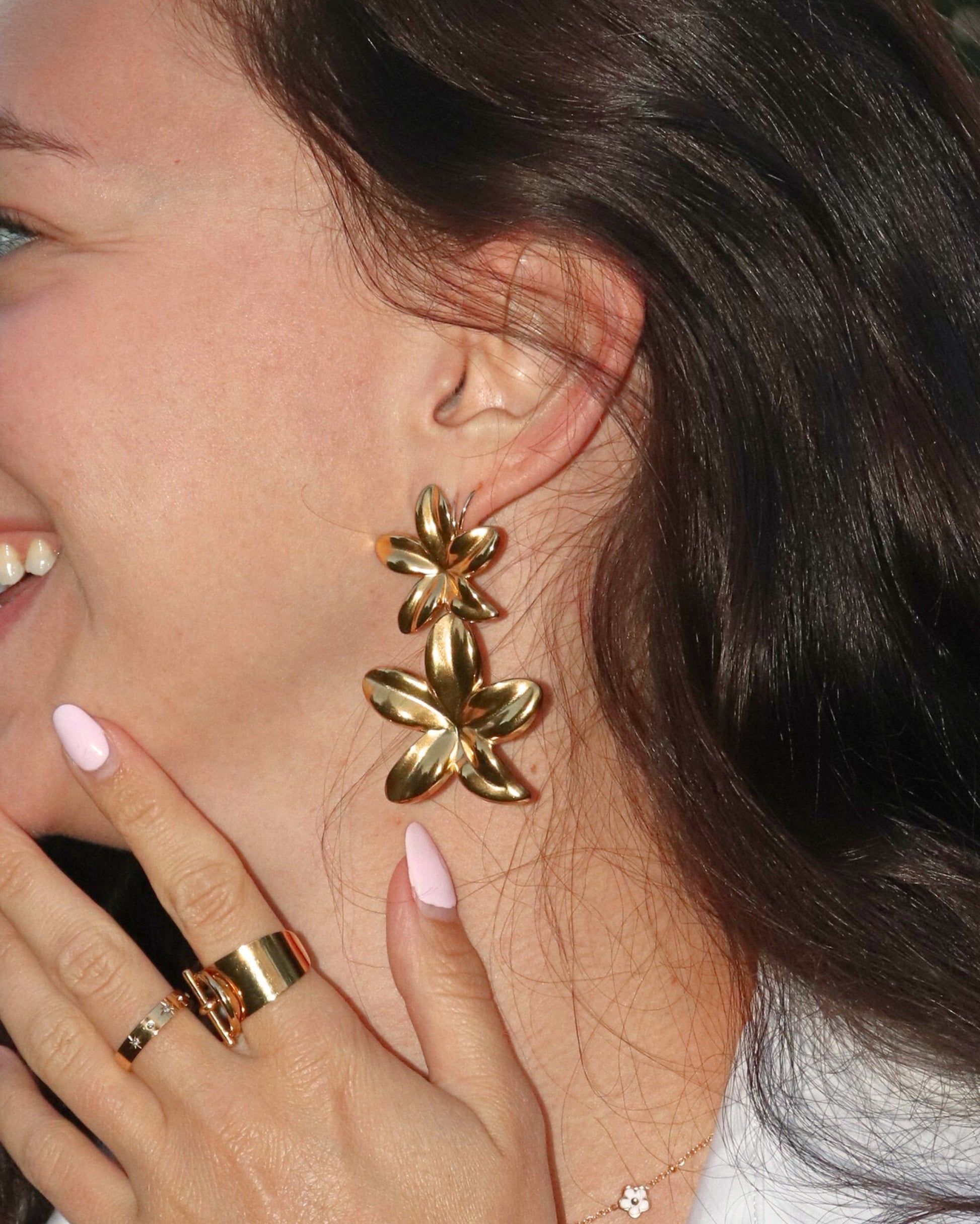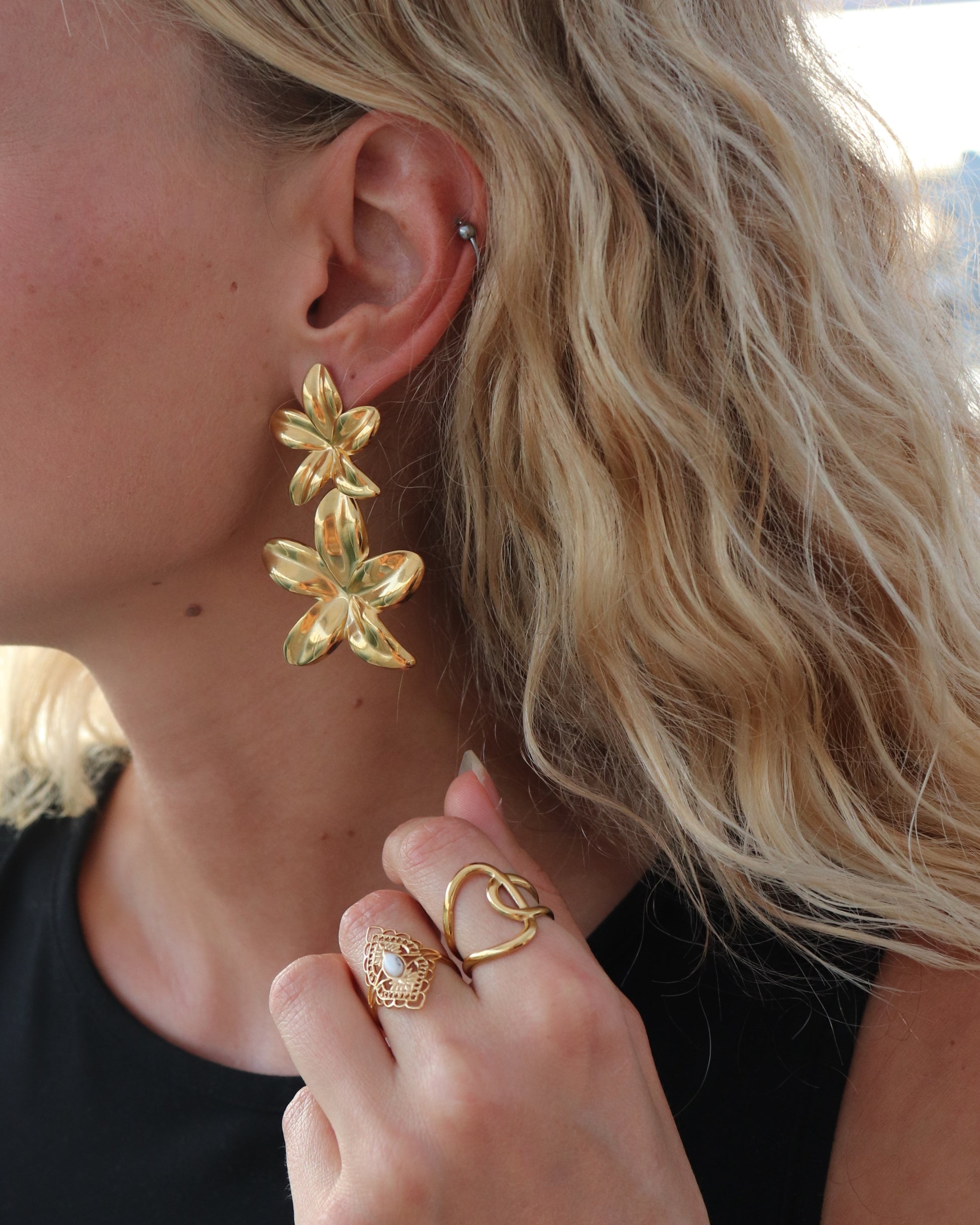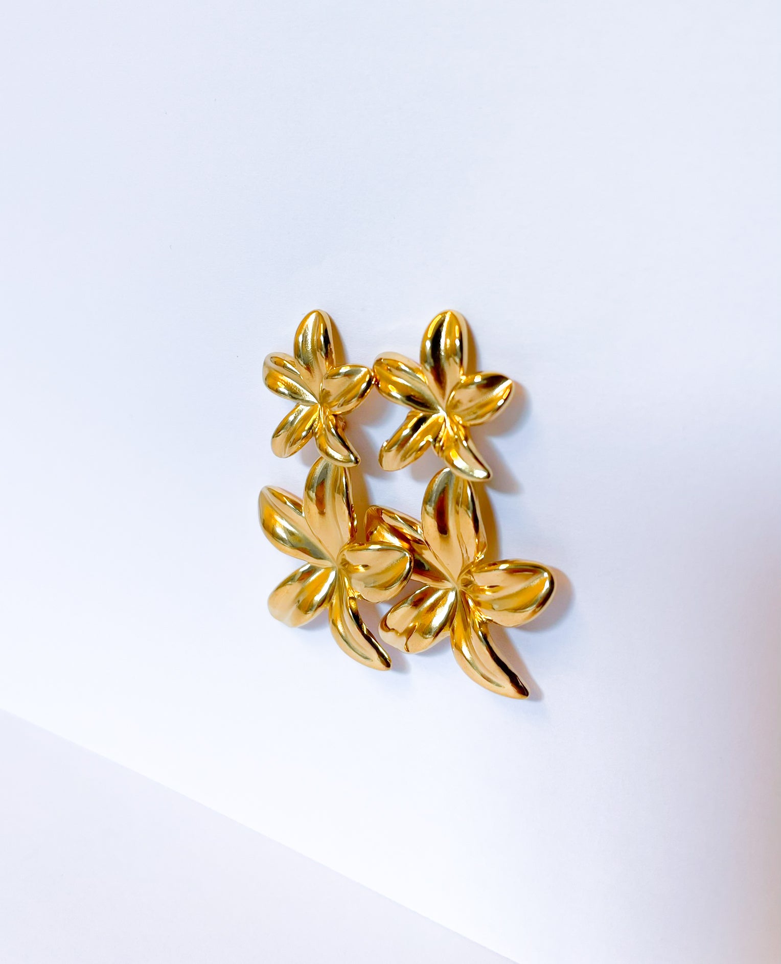 Découvrez nos boucles d’oreilles “Elinor”, un bouquet doré éclatant qui habille le visage avec audace et douceur. Chaque fleur, finement sculptée, semble capturer la lumière dans un mouvement élégant. Une pièce forte et féminine.