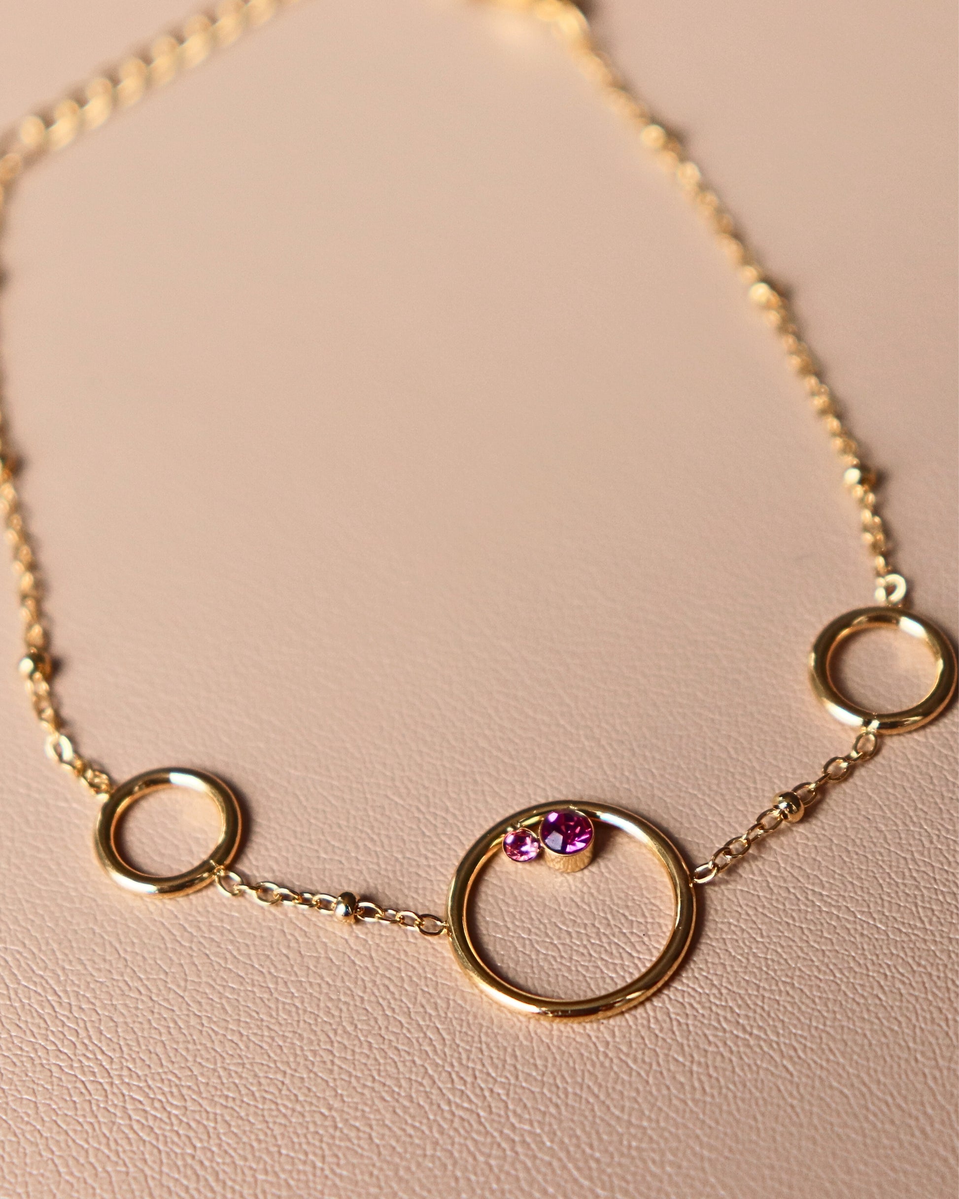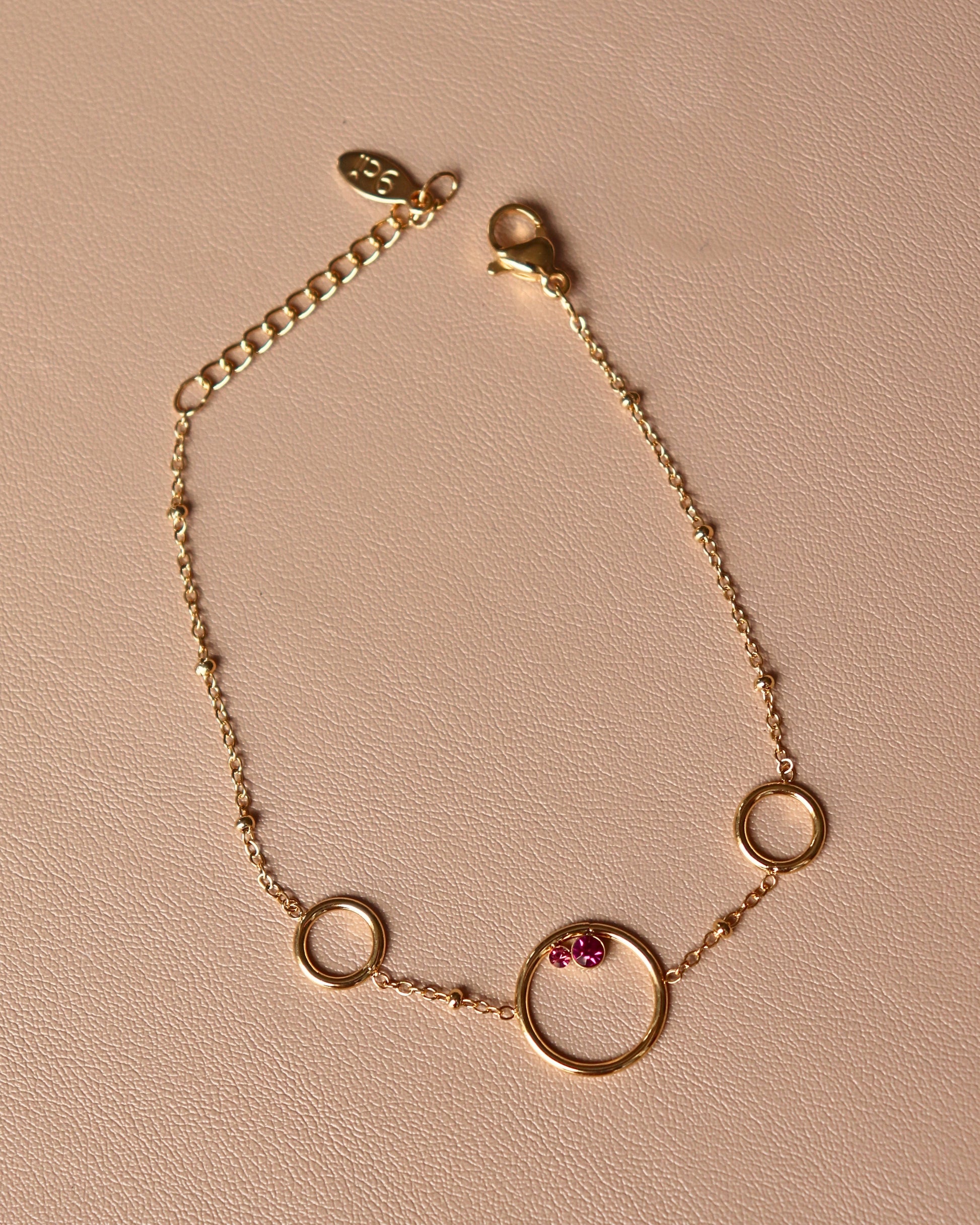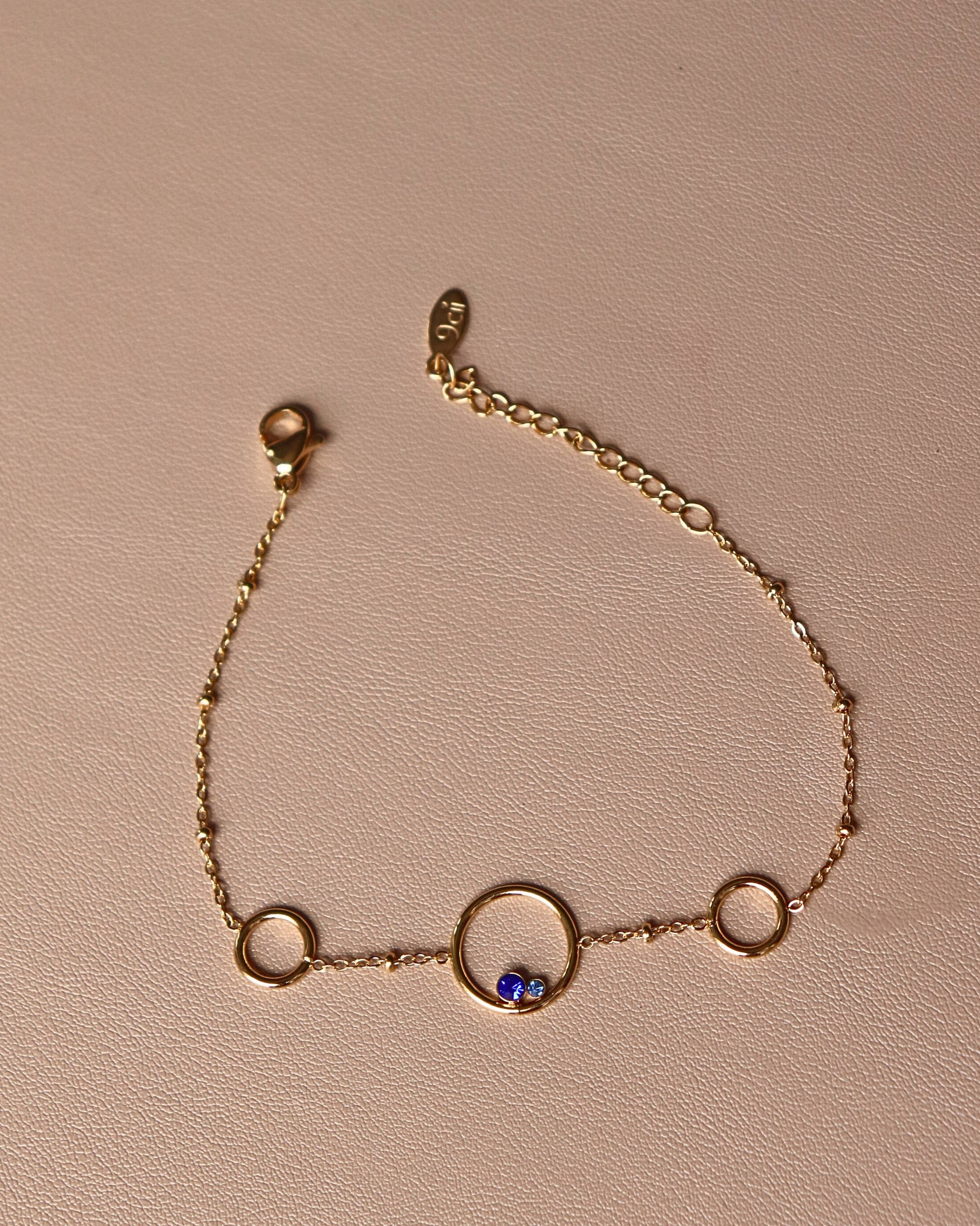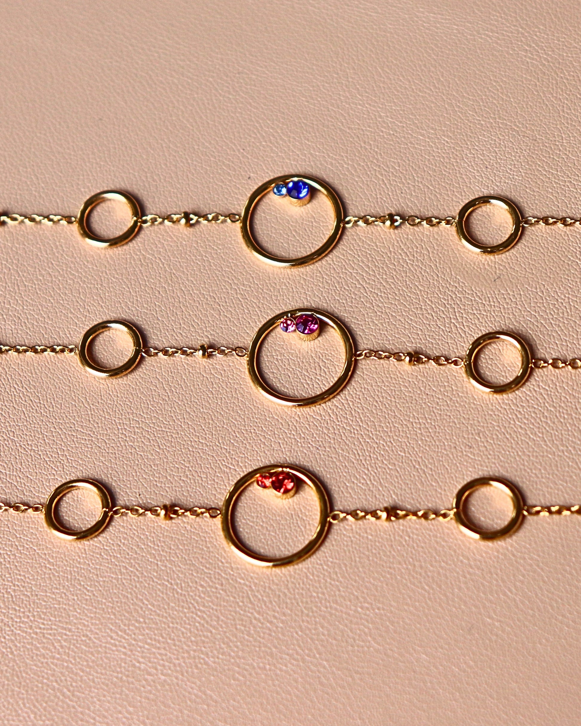 Découvrez notre bracelet “Sophie”, un jeu de cercles fins et délicats, rehaussé d’une pierre colorée pour une touche subtile et lumineuse. Élégant et minimaliste, il se porte seul ou en accumulation pour une allure chic et moderne.