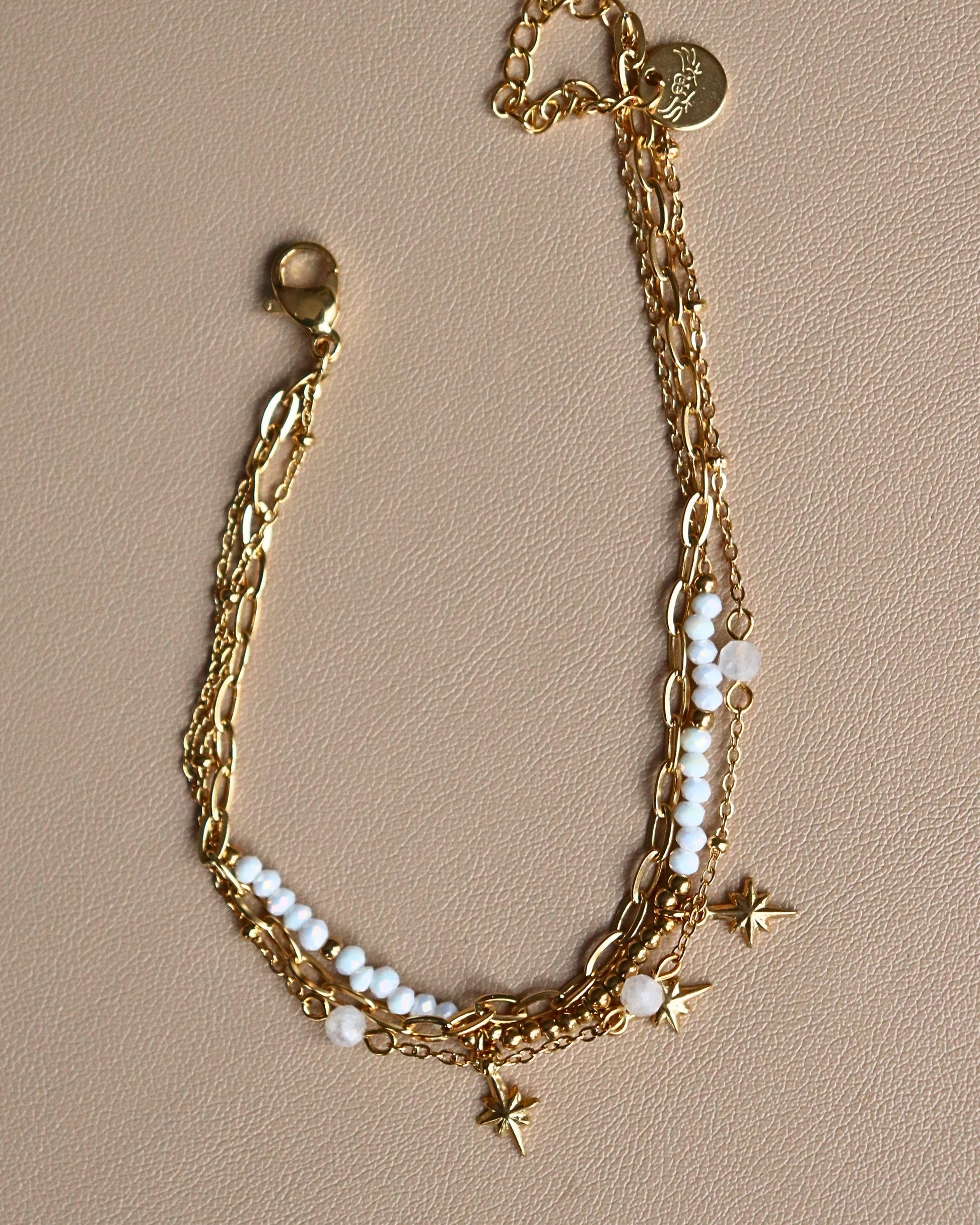 Le bracelet "Lola" illumine votre poignet avec ses petites perles et ses breloques étoiles suspendues. Inspiré du ciel nocturne et des constellations, il mêle délicatement éclat et poésie. Parfait pour ajouter une touche céleste à vos tenues, il allie élégance et fantaisie dans un esprit bohème.