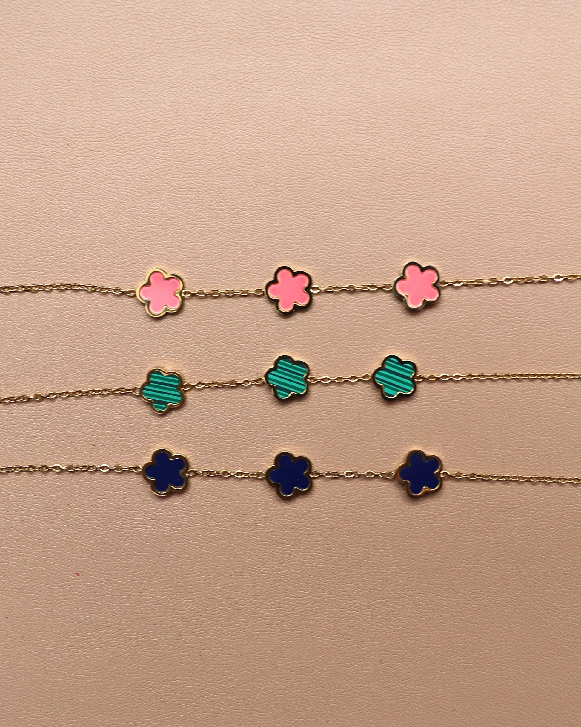 Découvrez notre bracelet “Floryn”, orné de trois fleurs émaillées pour une touche de couleur et de fraîcheur. Délicat et raffiné, il sublime votre poignet avec élégance.