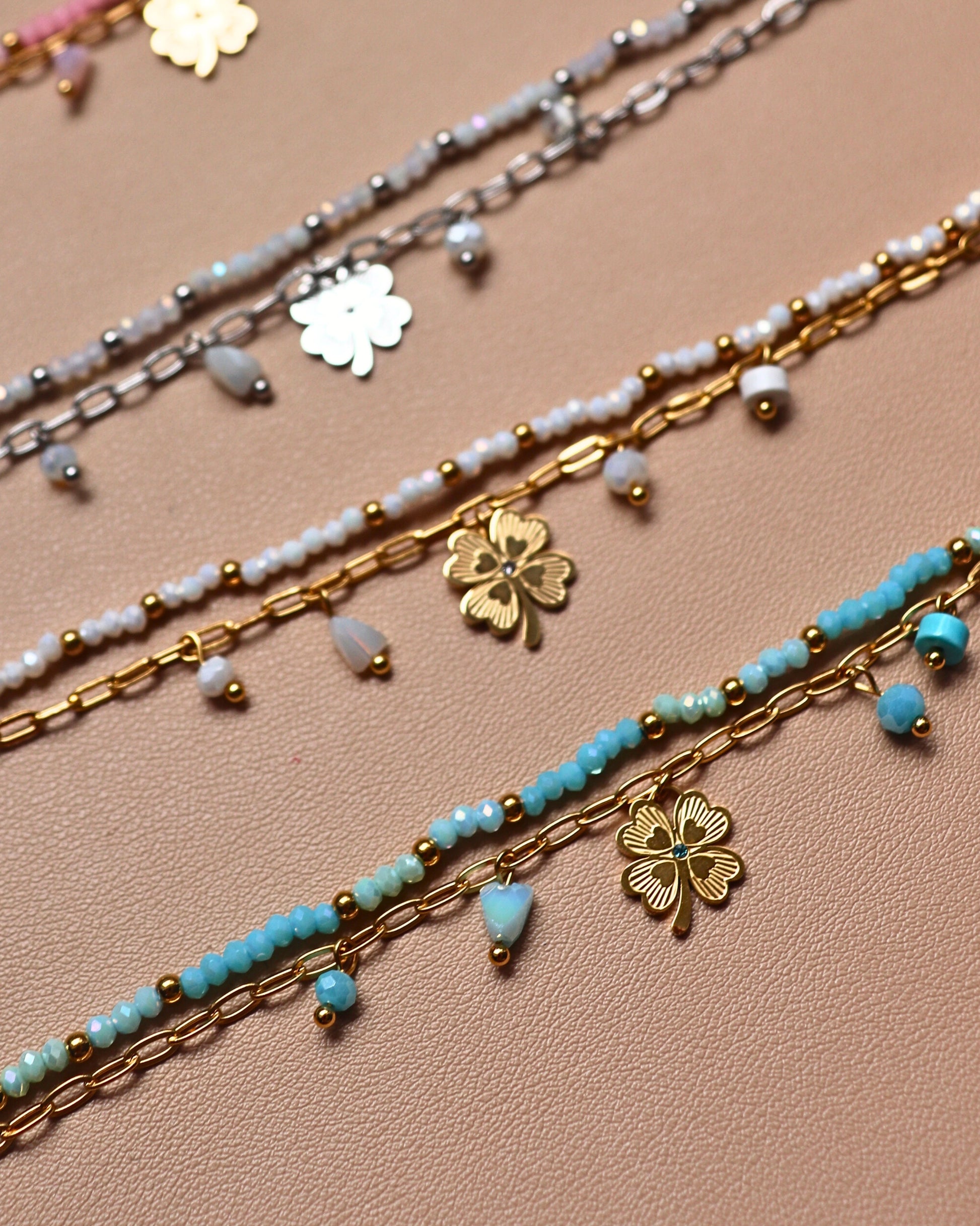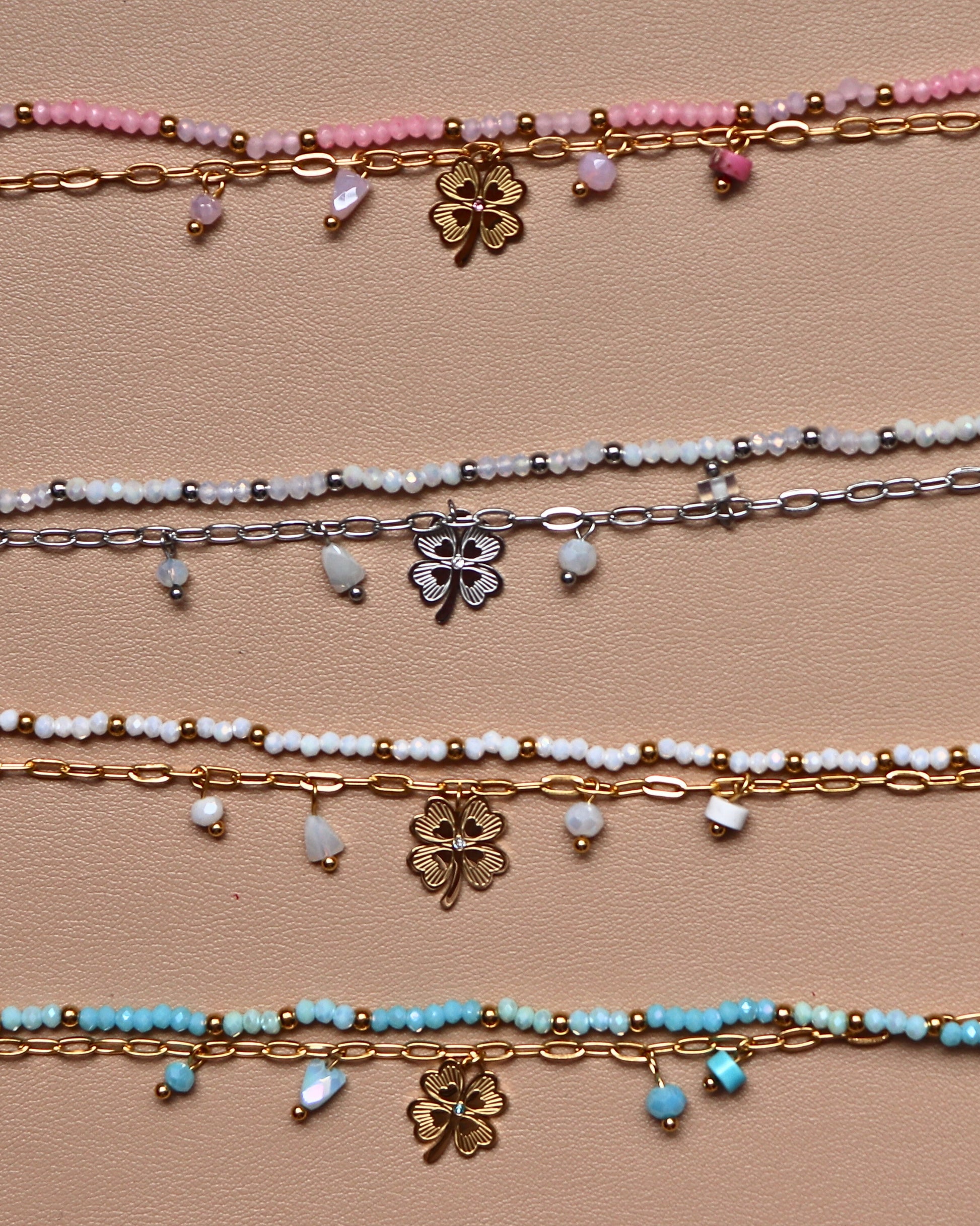 Laissez-vous séduire par notre bracelet "Esperanza", orné de perles délicates et d’un charm trèfle à quatre feuilles, symbole de chance et de prospérité. Son design raffiné en fait un accessoire idéal pour sublimer toutes vos tenues avec subtilité.