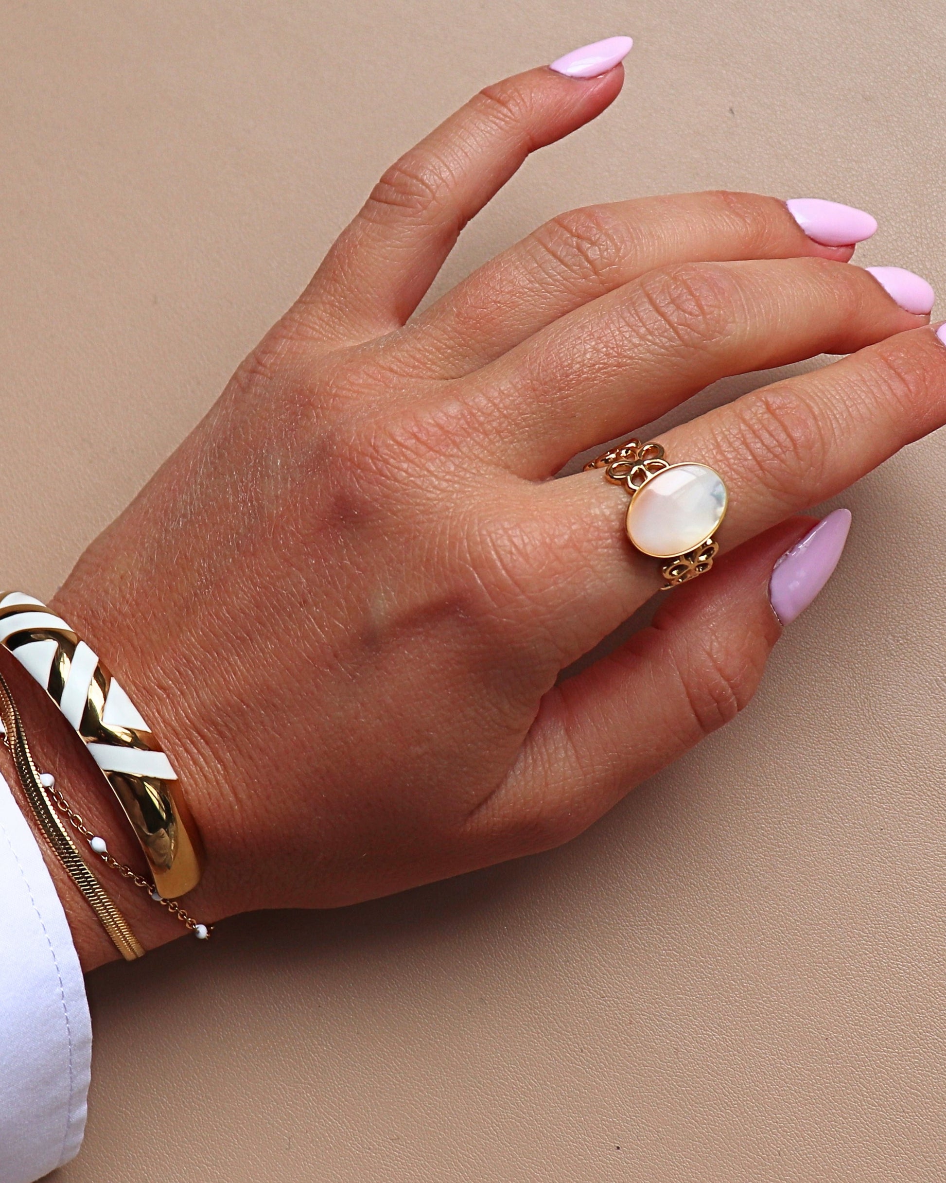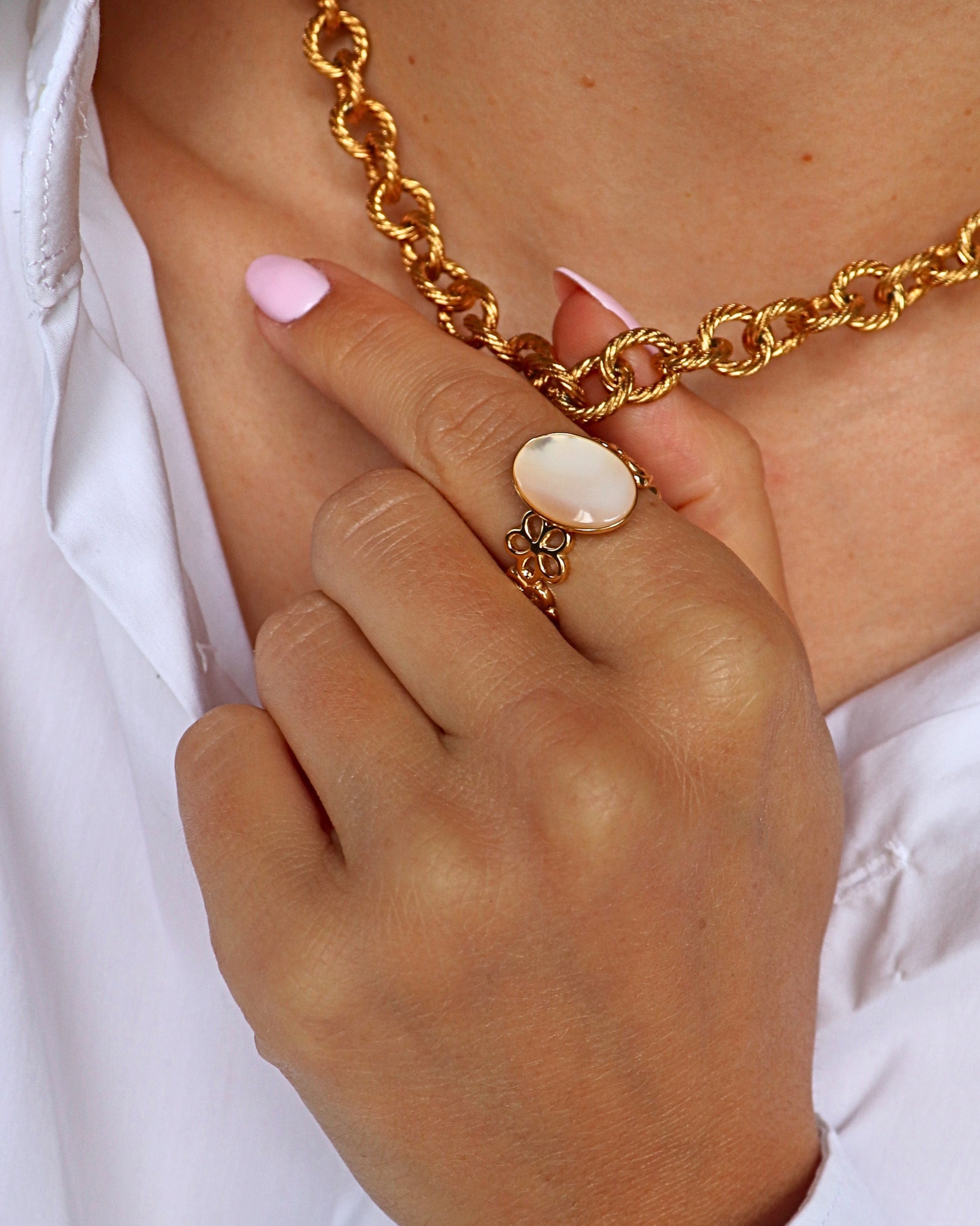 Découvrez notre bague Flora, un bijou unique sublimé par un anneau délicatement orné de fleurs et une pierre en nacre au centre. Un design poétique qui allie douceur et raffinement.