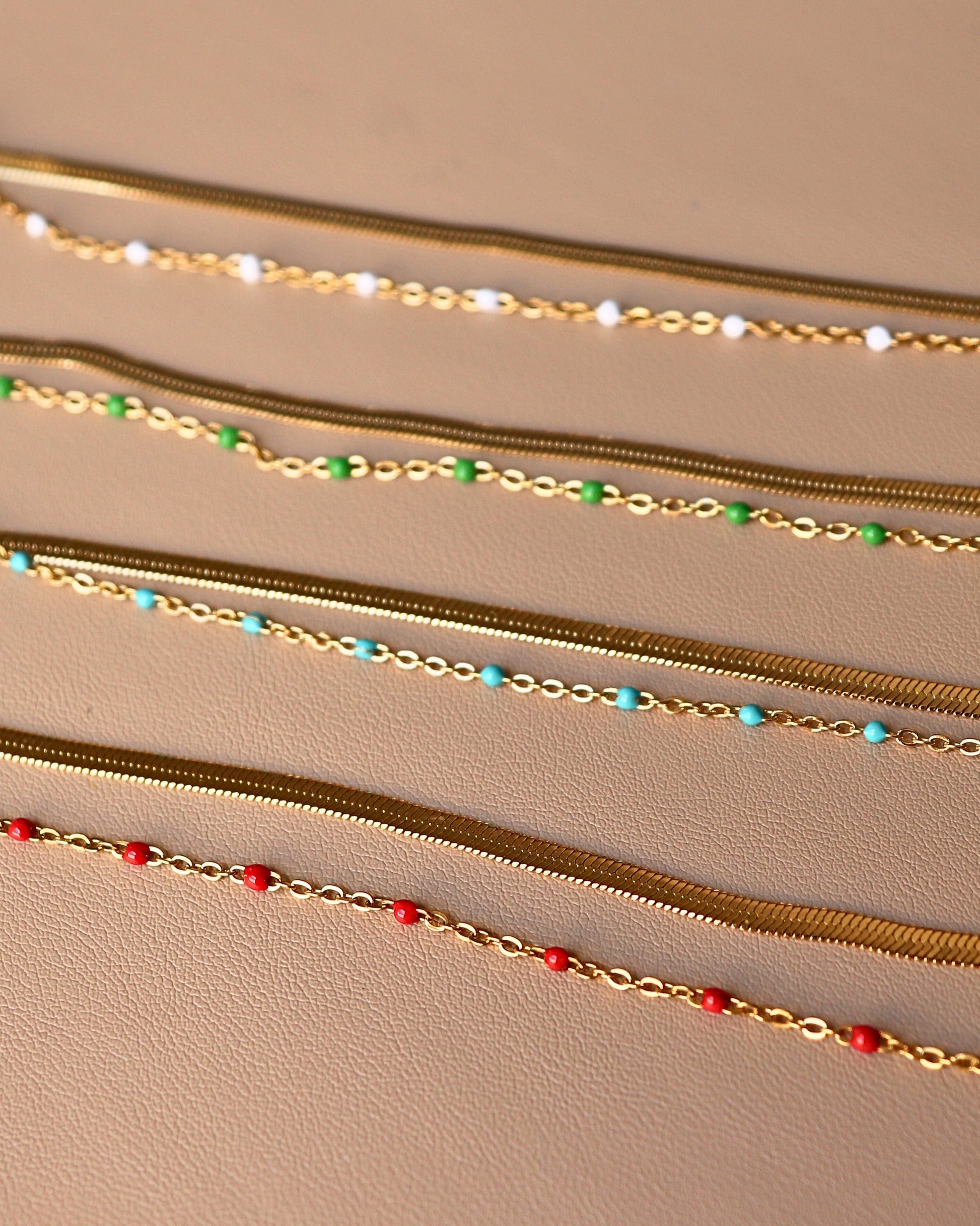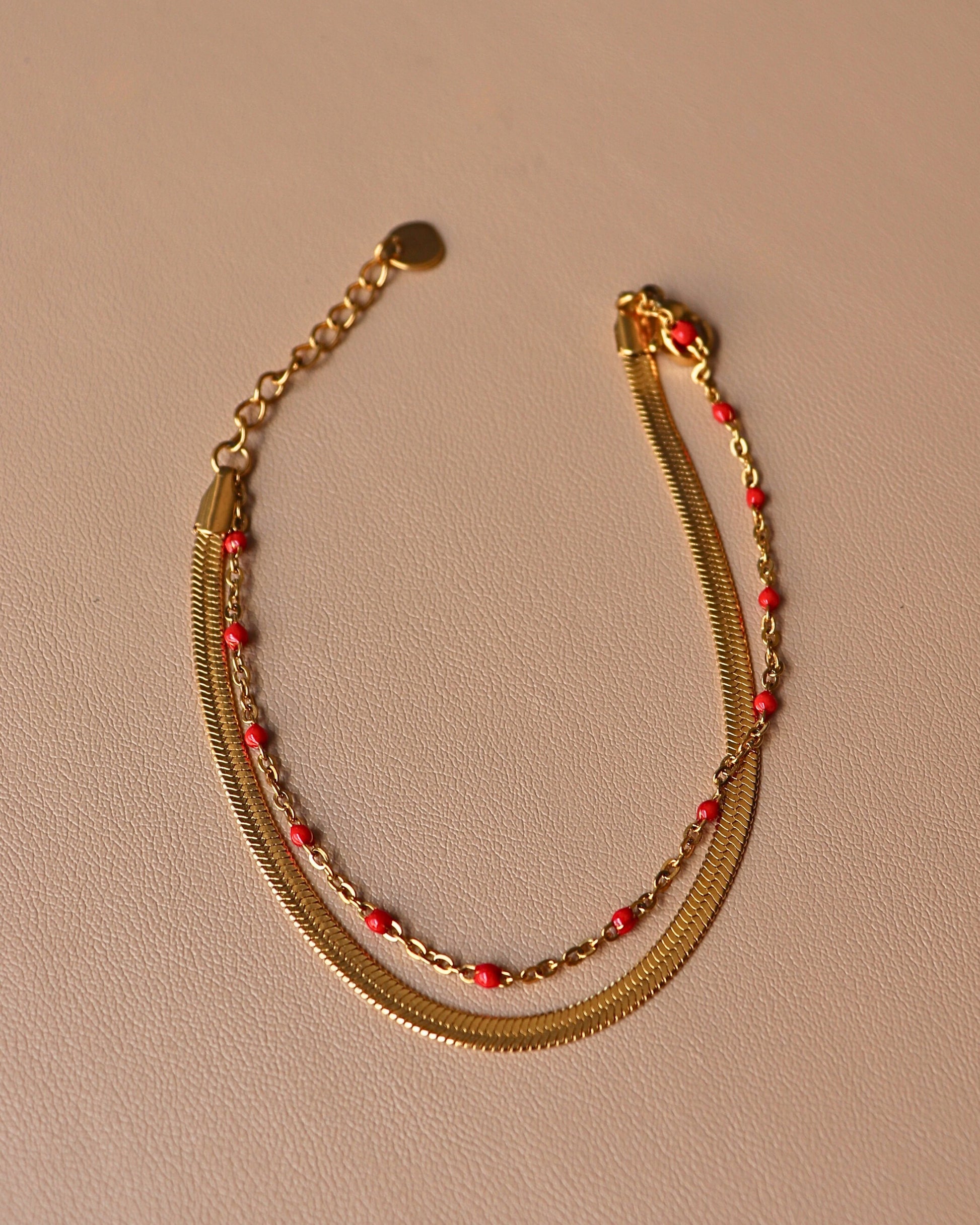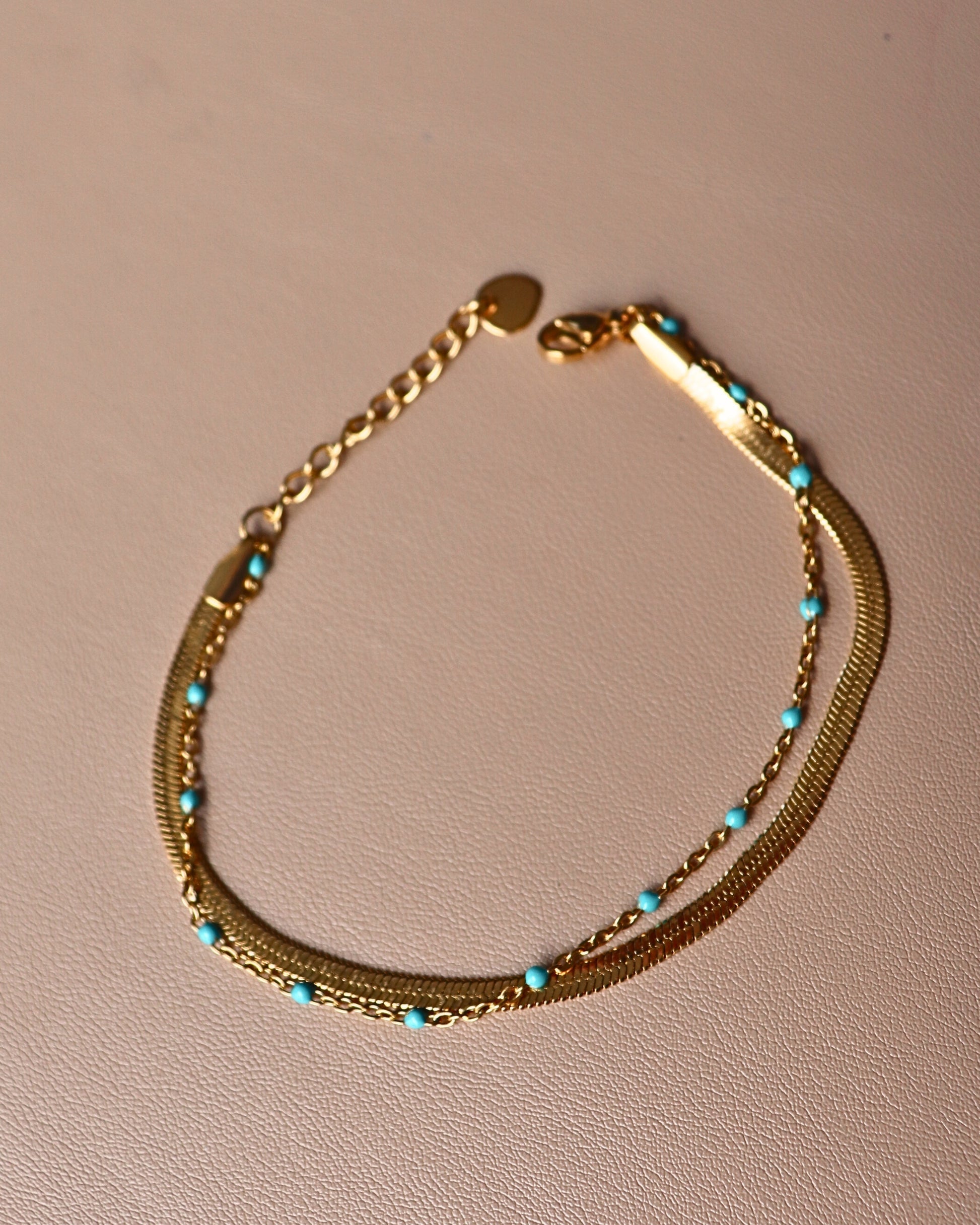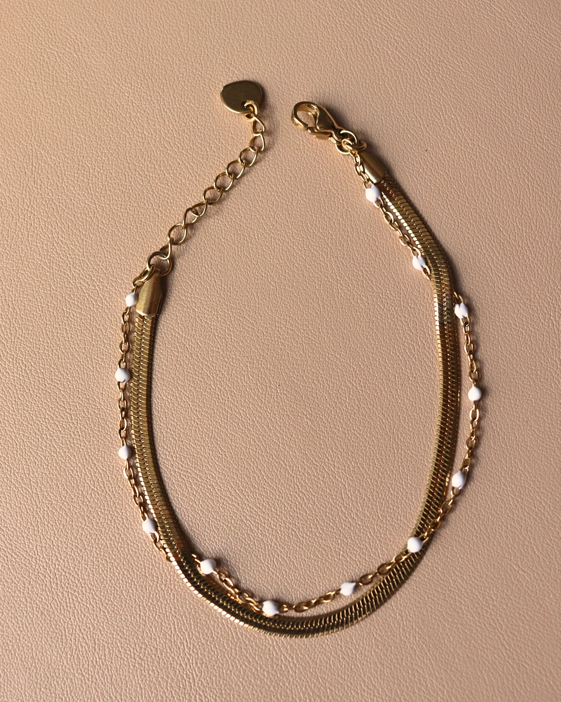 Découvrez notre bracelet “Nina”, une double chaîne dorée ornée de petites perles pour une touche douce et féminine. Son design fin et raffiné en fait un incontournable à porter seul ou en accumulation.