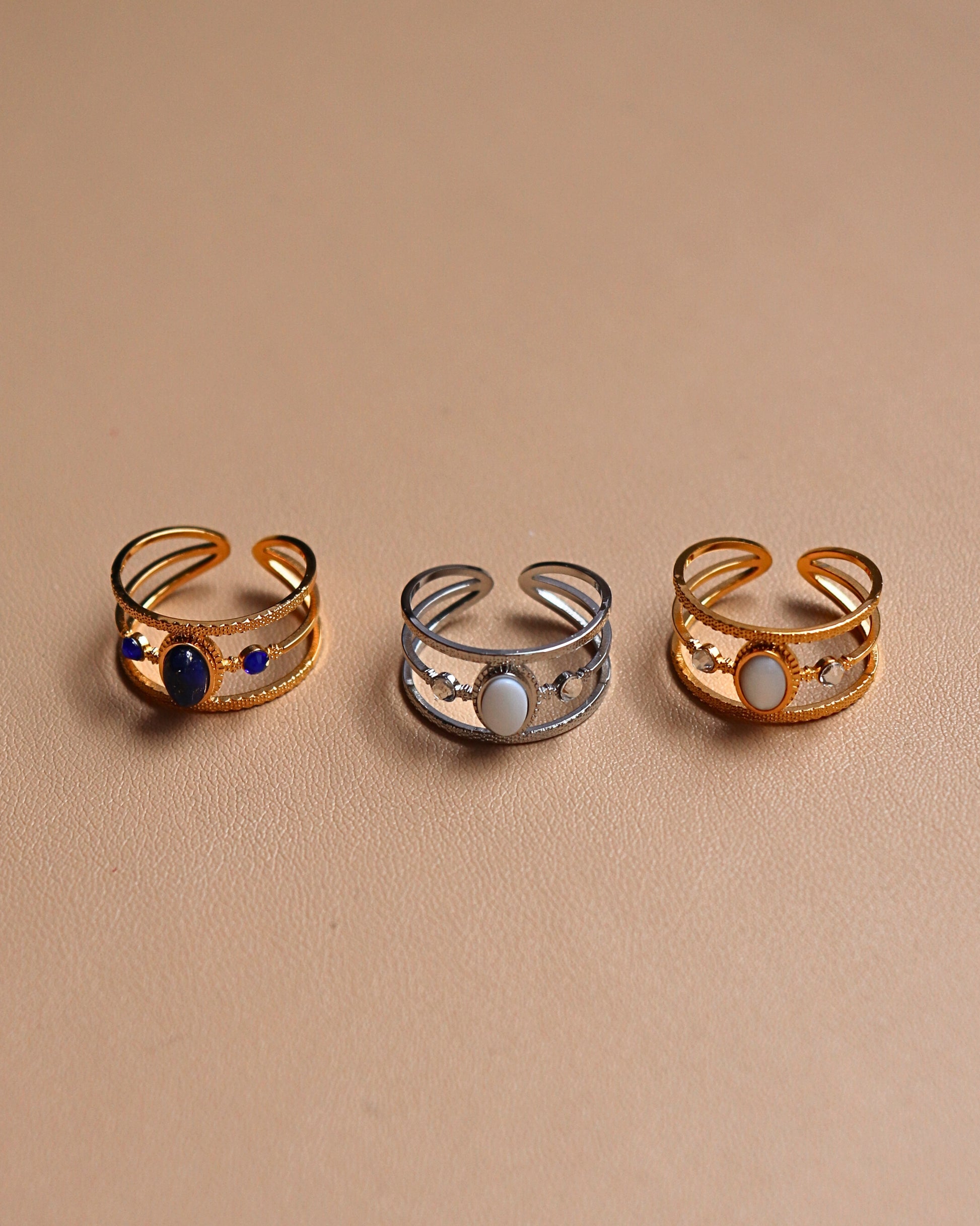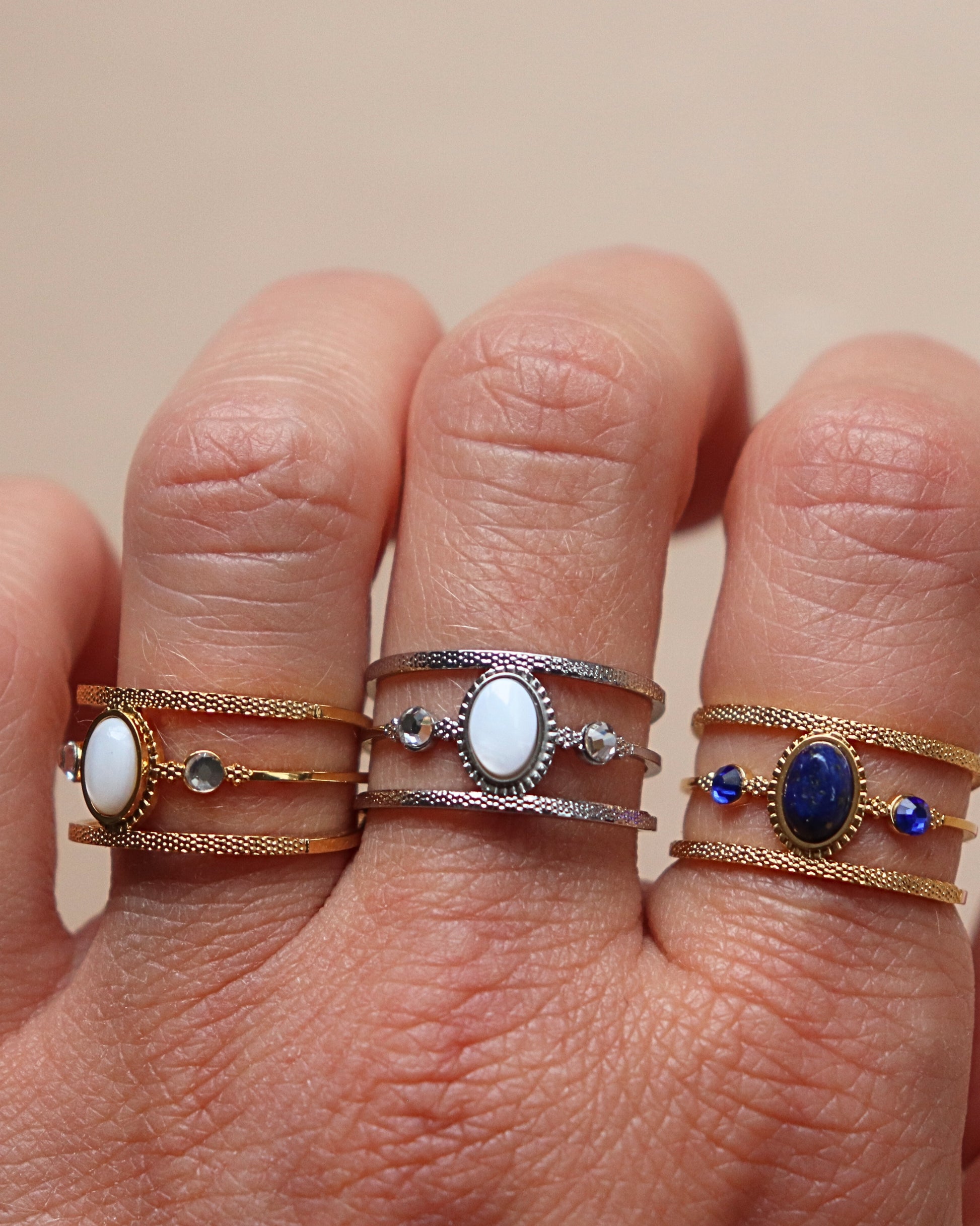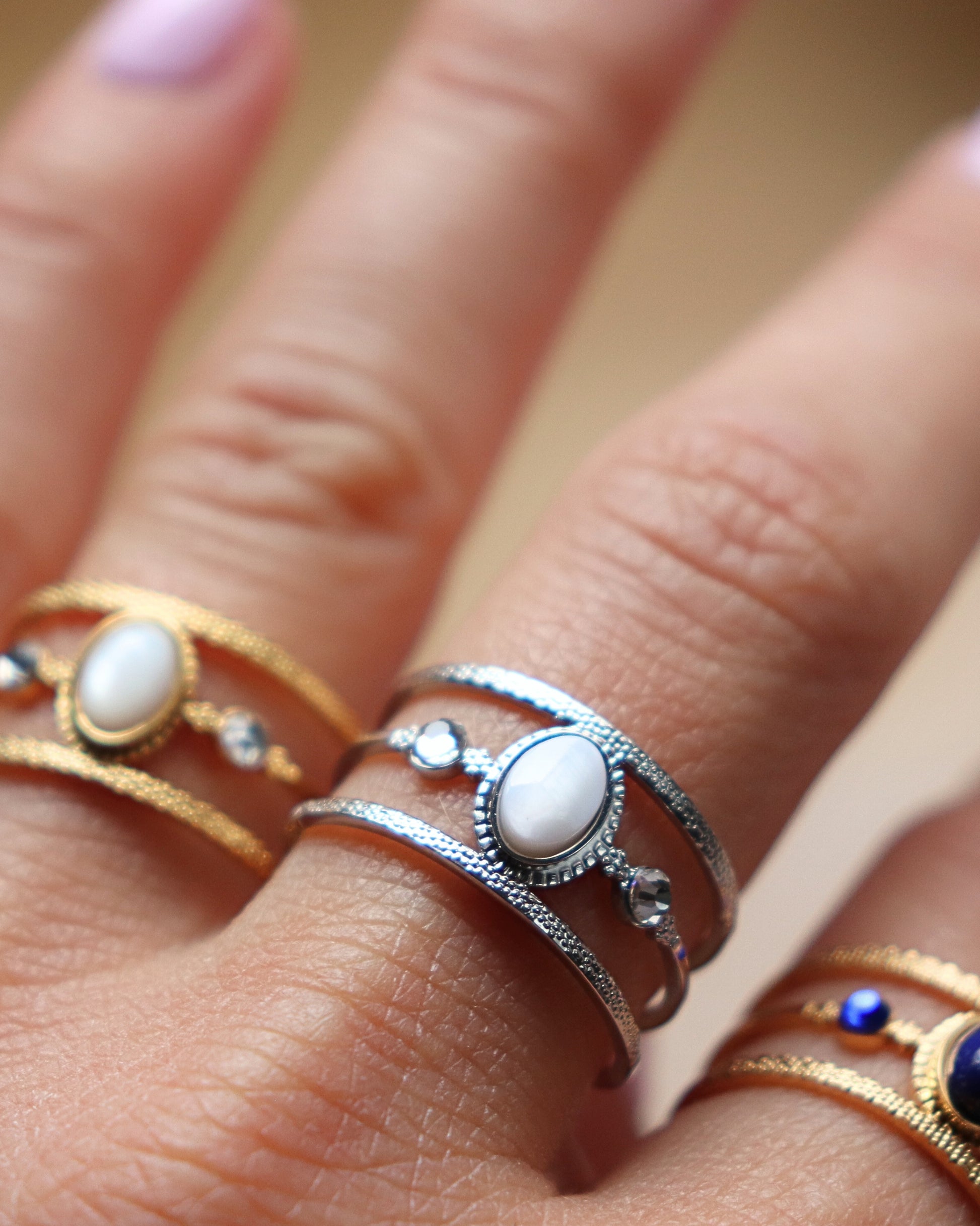 Découvrez notre bague "Zaphira", composée de trois anneaux qui subliment une pierre centrale. Son design travaillé et original apporte un charme oriental à vos mains.